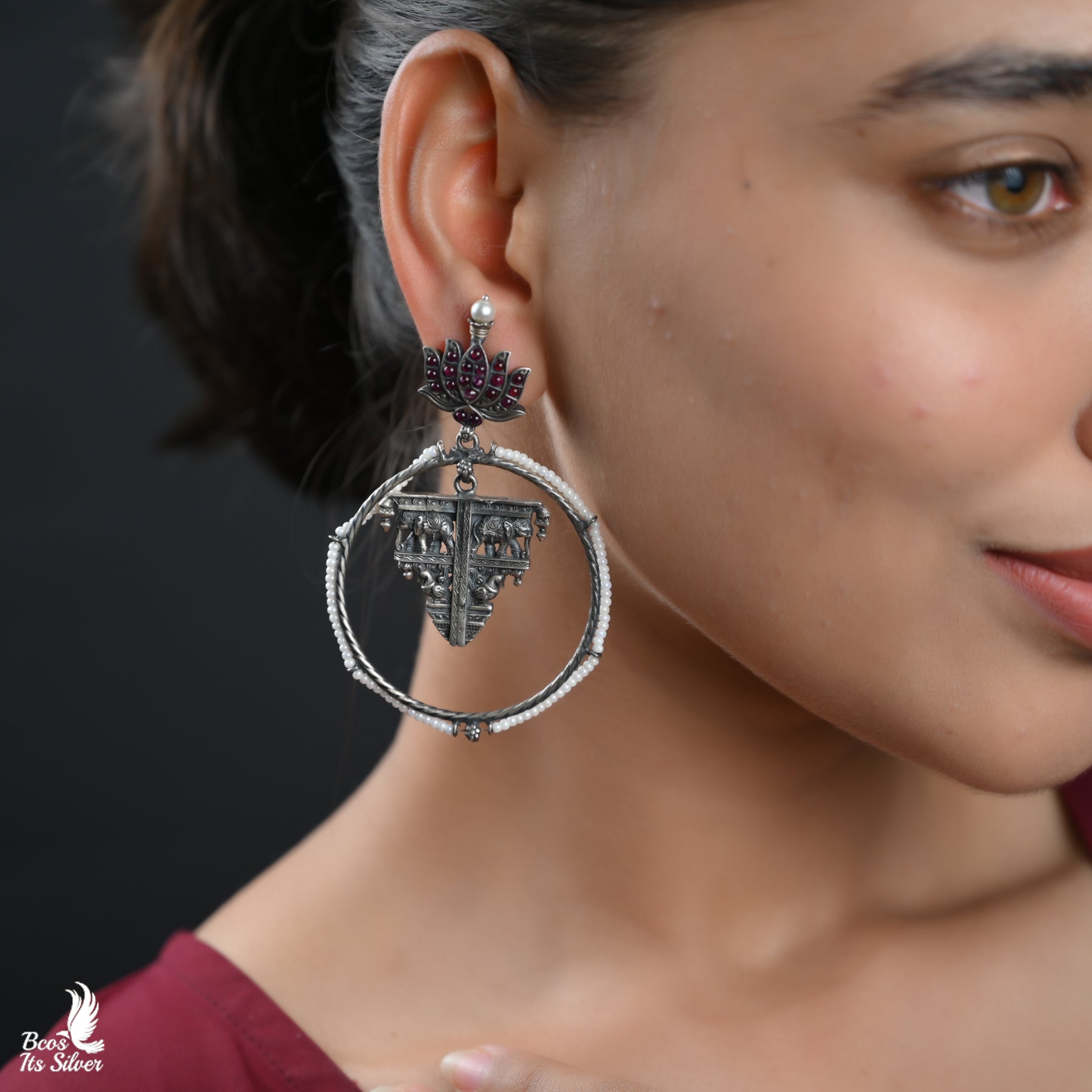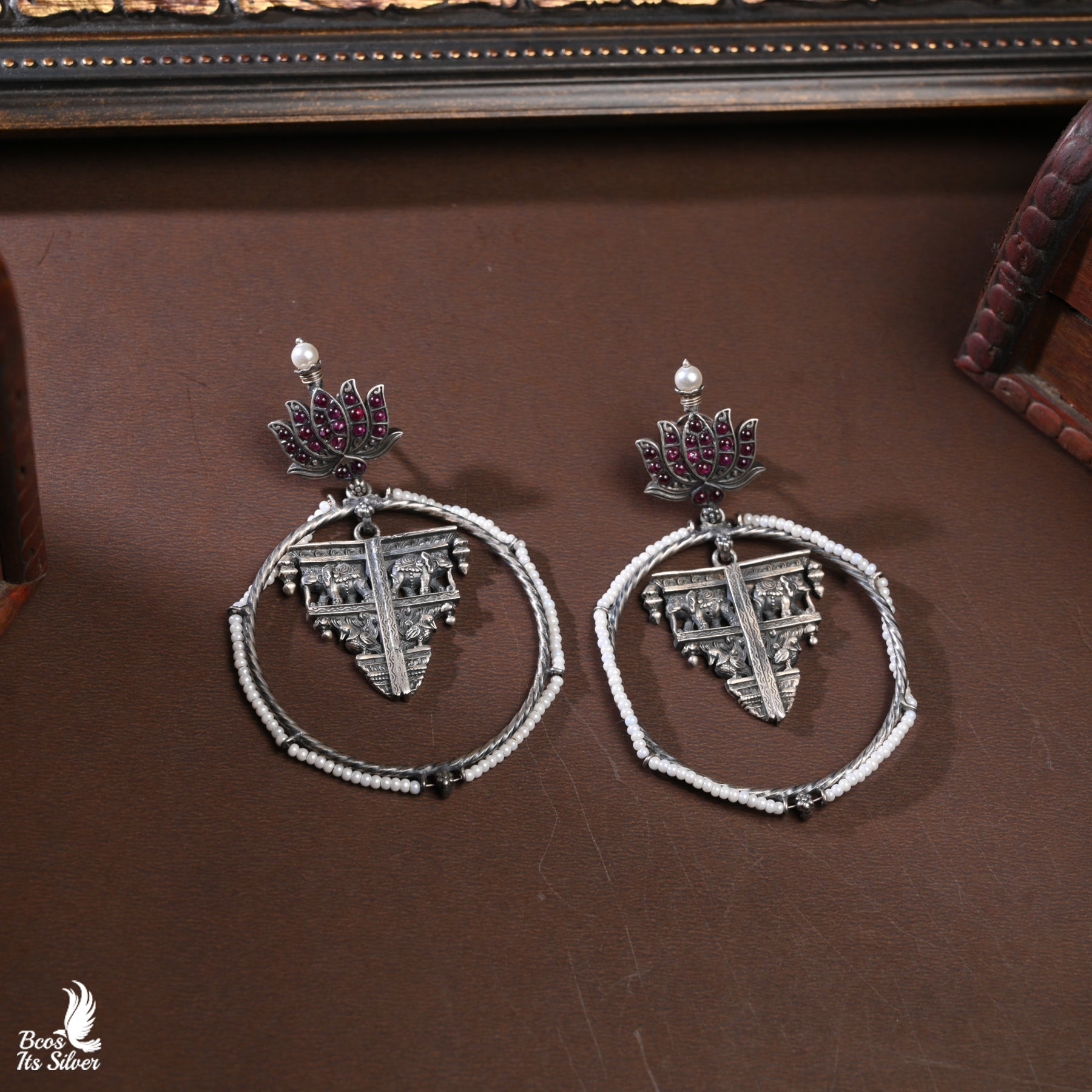 Made of Silver 92.5% Purity Oxidized Earrings, Design with Round Moon Flower And Pearl Ball & Stone Pendant Design.